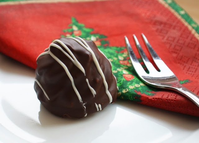 Damit die Rumberge nicht so langweilig aussehen spindel ich sie mit weißer Schokolade ab. Das Auflösen funktioniert genauso wie mit der Zartbitterkuvertüre. Dann drehe ich mir aus einem Backpapierdreieck ein Tütchen, fülle die Weiße Schokolade ein und schneide die Spitze ab. Das Tütchen schnell über die Rumberge schwenken und dabei leichten Druck ausüben. Dadurch ergibt sich ein Streifenmuster, das die Optik etwas auflockert.