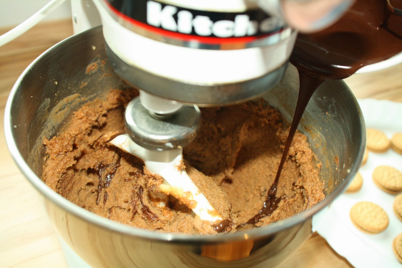 Den Bisquitboden und die 5 großen Kekse zerbröseln und in die Kitchen- Aid geben. Marzipan, Nougat und Rum ebenfalls dazugeben. Den Nougat, wenn er zu fest ist, in der Mikrowelle erwärmen. Alles zusammen in der Küchenmaschine gut durchrühren bis wir eine braune, leicht glänzende Masse haben. Die 150g Kuvertüre raspeln und in der Mikrowelle erwärmen. Wer möchte kann das natürlich auch im Wasserbad machen, aber mir dauert das zu lange. Dann die Kuvertüre mit in den Kessel der KitchenAid geben, das Gerät dabei weiterrühren lassen, damit sich die flüssige Schokolade schnell in der Masse verteilt.