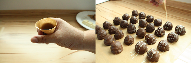 Die Rumberge nun kopfüber in die Kuvertüre tunken, herausholen und auf einem Gitter abtropfen lassen. Danach, noch bevor sie fest wird, auf ein Backpapier setzen, damit wir einen glatten Boden bekommen.