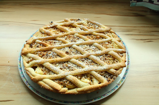 Das Dekor wird ein Gittermuster. Dafür holt ihr den Mürbeteig aus dem Kühlschrank und knetet ihn wieder einmal durch. Jetzt habt ihr die Wahl. Ihr könnt den Mürbeteig zu Strängen rollen, die dann auf den Kuchen gelegt werden oder ihr rollt ihn aus, schneidet ihn in Streifen und legt ihn auf den Kuchen. Mir gefällt die Variante mit den gerollten Strängen, so wie ihr sie auf den Fotos sehen könnt besser.